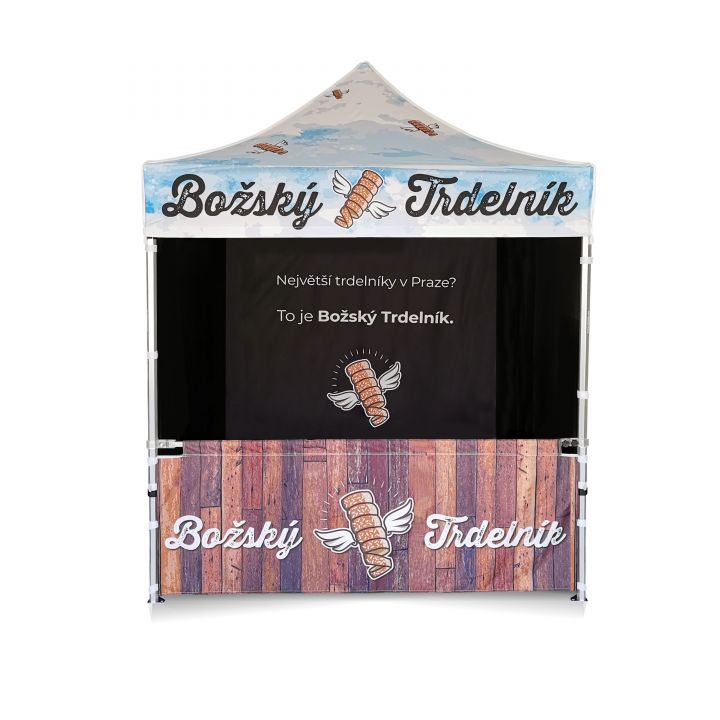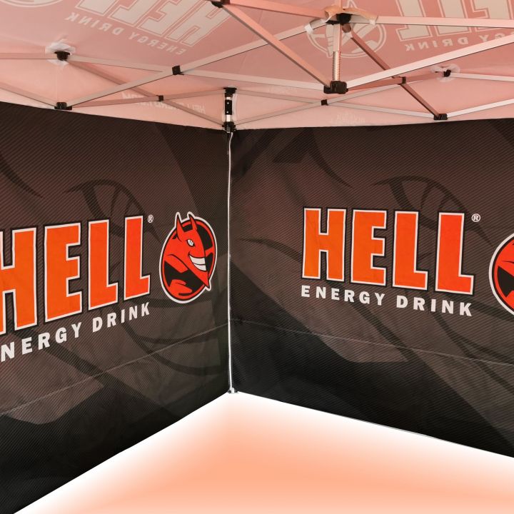 Reklameskure med digital sublimationsprint. Trykket udføres via en kemisk proces, hvor blækket trænger direkte ind i stoffets struktur under høje temperaturer. Logo, tekst eller enhver form for grafik på indersiden eller ydersiden af skuret efter kundens ønske.