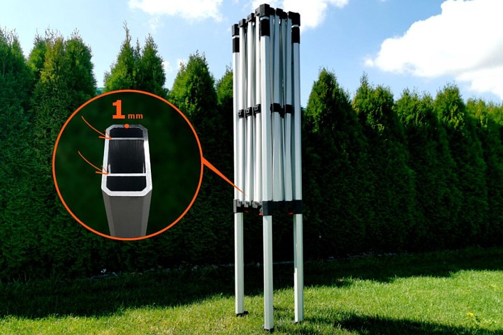 Trods sin lave vægt rangerer EXCLUSIVE aluminiumsteltet blandt de stærkeste på markedet. Det er fremstillet af tykvæggede aluminiumsprofiler, der perfekt håndterer vejrets udfordringer. Hver komponent er blevet omhyggeligt testet for at give dig et produkt, du kan stole på i mange år. Som bekræftelse på kvaliteten får du en ekstraordinär fem års garanti ved køb.