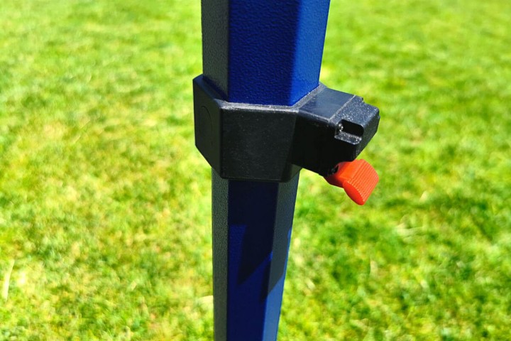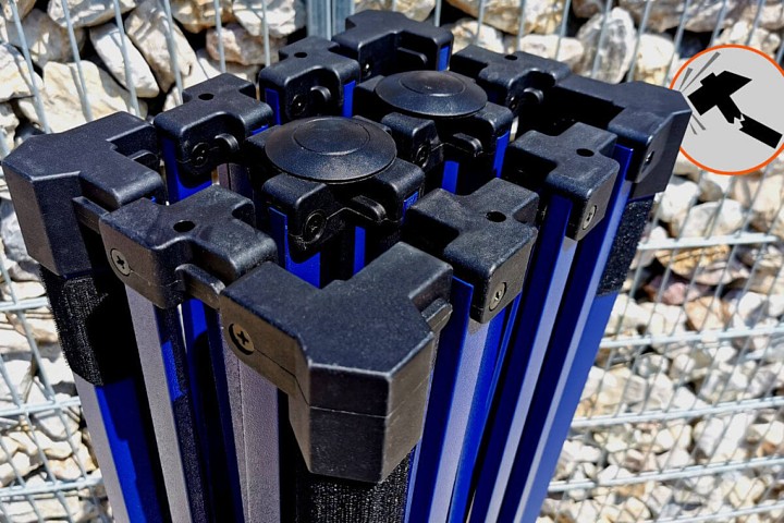 Opsætning og nedtagning af reklametelte er let: med et enkelt træk tilpasser du konstruktionen til ønsket højde. Ved at bruge taghøjde-kontrollen kan du justere taget efter dine behov. Telttets diskrete farve passer ind i omgivelserne, og presenningen kan tilpasses f.eks. til farverne på dit produkt. Erfaring viser, at teltets design er lige så vigtigt som kvaliteten. Vi skiller os ud fra konkurrenterne med konstruktionens mørkeblå farve.