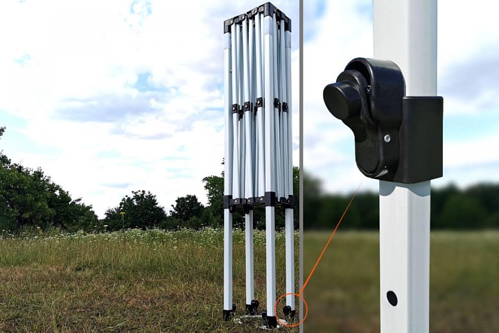 Hurtig opsætning og tidsbesparelse er vigtigt. Med det automatiske system er der ingen værktøjer nødvendige. Få trin, og teltet er klar til salg. Hver del kan udskiftes takket være skruede forbindelser. Hvis konstruktionen beskadiges, skal kun delen udskiftes. Reservedele er gratis det første år.