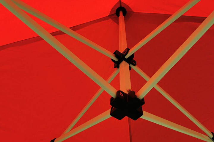 Tagdugen i polyester er belagt med et lag PVC på indersiden. Hver syning er dobbelt og forseglet med varmebånd. Saksetelte kan bruges i haven, på terrassen eller som salgsbod på messer og markeder. Den store fordel er saksesystemet, der kan opstilles på få sekunder.