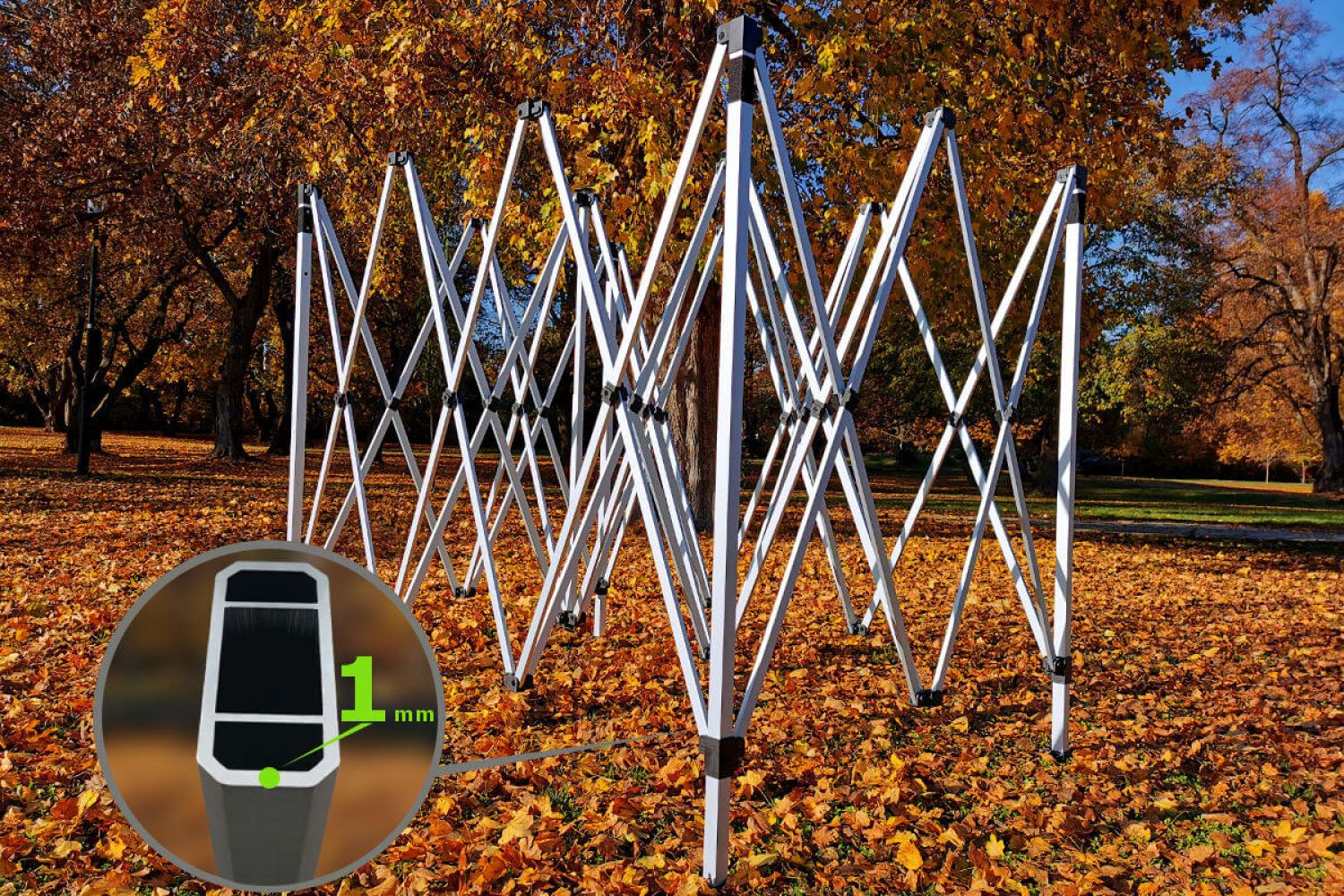 Det mest anvendte materiale er aluminium. Det har fantastiske egenskaber: lav vægt, men stor styrke og pålidelighed. Den lave vægt er værdifuld, hvis du ofte sælger under teltet og skal transportere det. Teltet kan åbnes og lukkes på få sekunder.