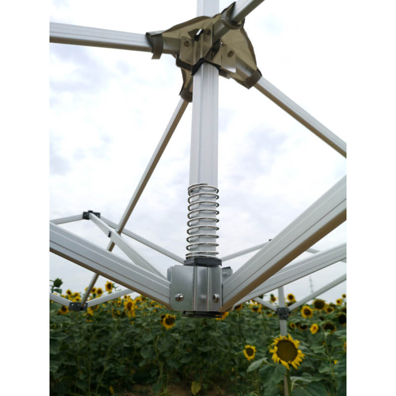 Teltets fundament består af forstærkede aluminiumsprofiler, der garanterer ekstrem stabilitet. Teltet står på seks robuste ben i hexagonform. På trods af vægten (ca. 100 kg) og den enorme størrelse kræves der intet værktøj til opsætning. Takket være det innovative saksesystem kan én person klare det. Alle samleled er skruet og udskiftelige, hvilket letter eventuel service.