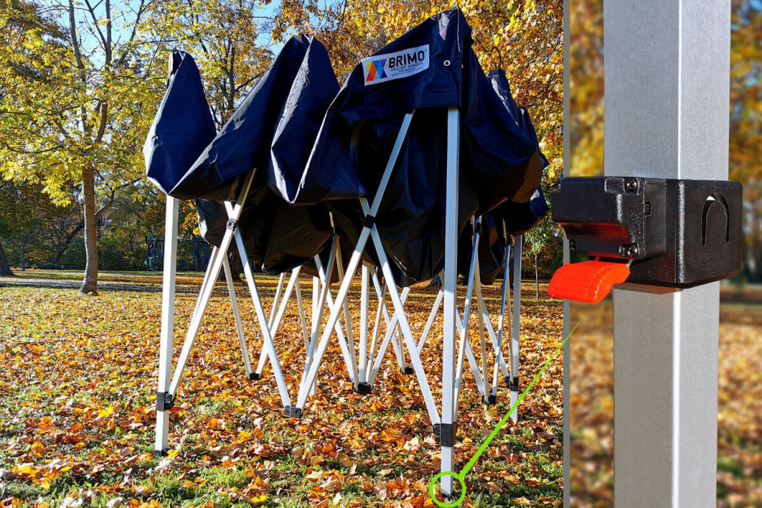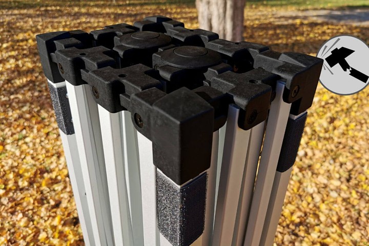 Den samlede opsætningstid for teltet er kun få sekunder. På et øjeblik skaber du et fuldstændigt beskyttet område med reklamepavillonen. Omhyggeligt udførte komponenter gør det nemt at folde teltet ud. Det er så simpelt som at åbne en paraply. Vi har tænkt på at spare tid, som er meget værdifuld før salg eller præsentation. Ingen ønsker at spilde tid; vi vil alle gøre alt hurtigt, så vi kan fokusere på selve salget.