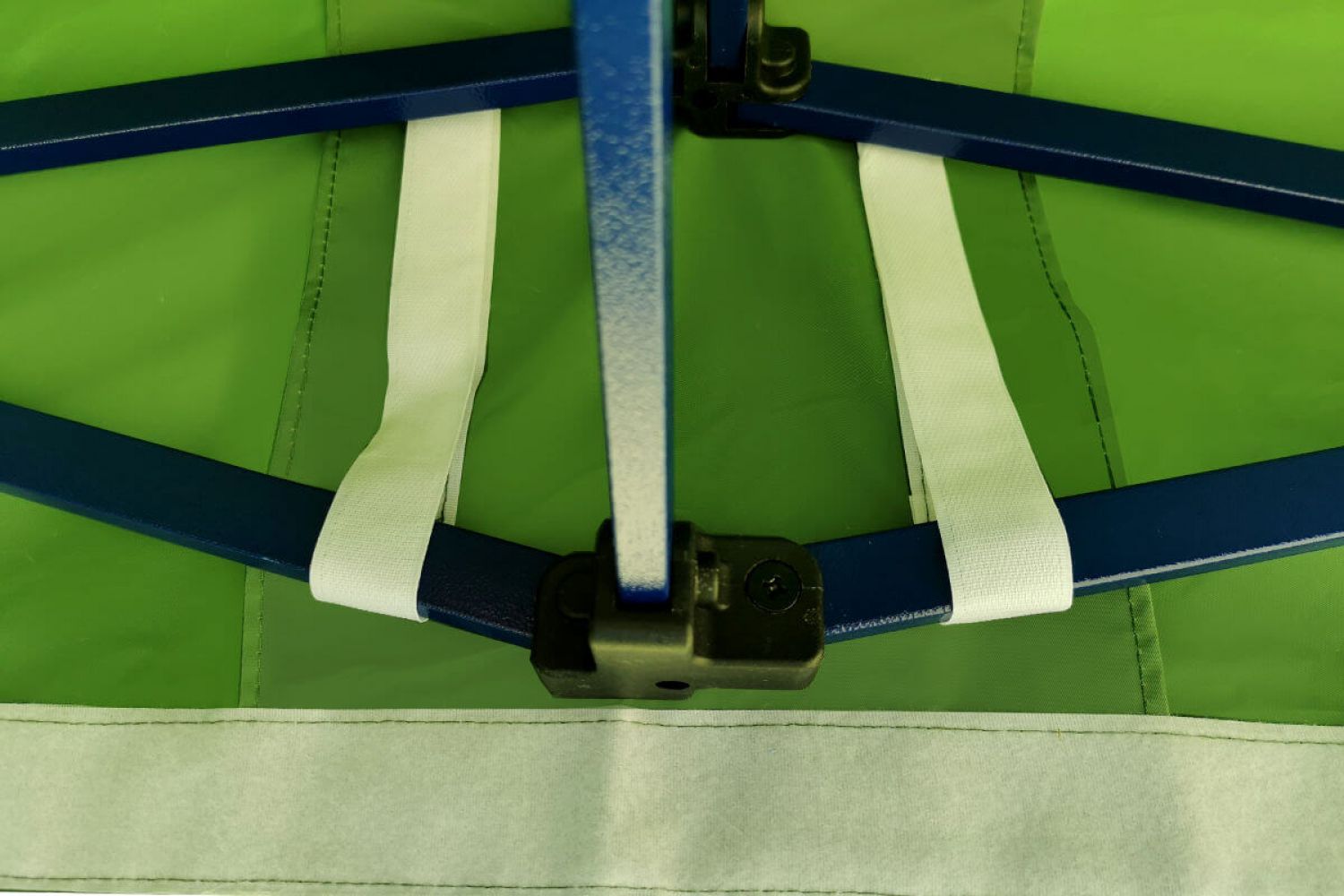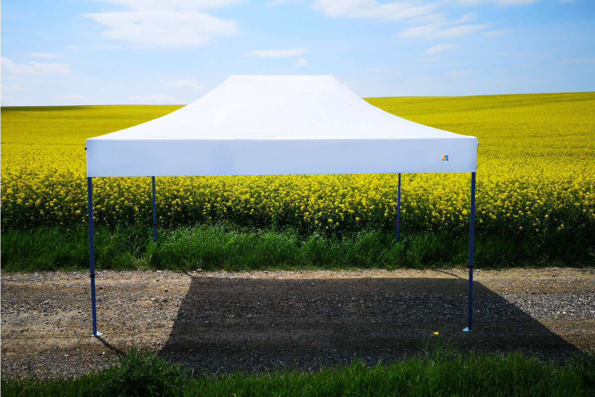 Opsætning og nedtagning af reklametelte er let: med et enkelt træk tilpasser du konstruktionen til ønsket højde. Ved at bruge taghøjde-kontrollen kan du justere taget efter dine behov. Telttets diskrete farve passer ind i omgivelserne, og presenningen kan tilpasses f.eks. til farverne på dit produkt. Erfaring viser, at teltets design er lige så vigtigt som kvaliteten. Vi skiller os ud fra konkurrenterne med konstruktionens mørkeblå farve.