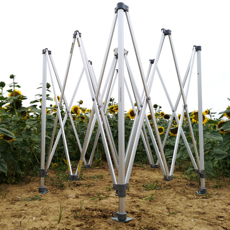 Trods sine dimensioner er håndteringen af teltet lynhurtig. Takket være saksesystemet er montering og afmontering slet ikke svært – det kræver kun én til to personer at stille det op. Konstruktionen er fremstillet af eloxeret aluminium. Ved at øge tykkelsen på de indvendige profiler til 1,8 mm er der opnået perfekt stabilitet og høj konstruktionsstyrke. Massive sekskantede ben sikrer, at helheden står fast selv på ujævne overflader (ved korrekt forankring).
