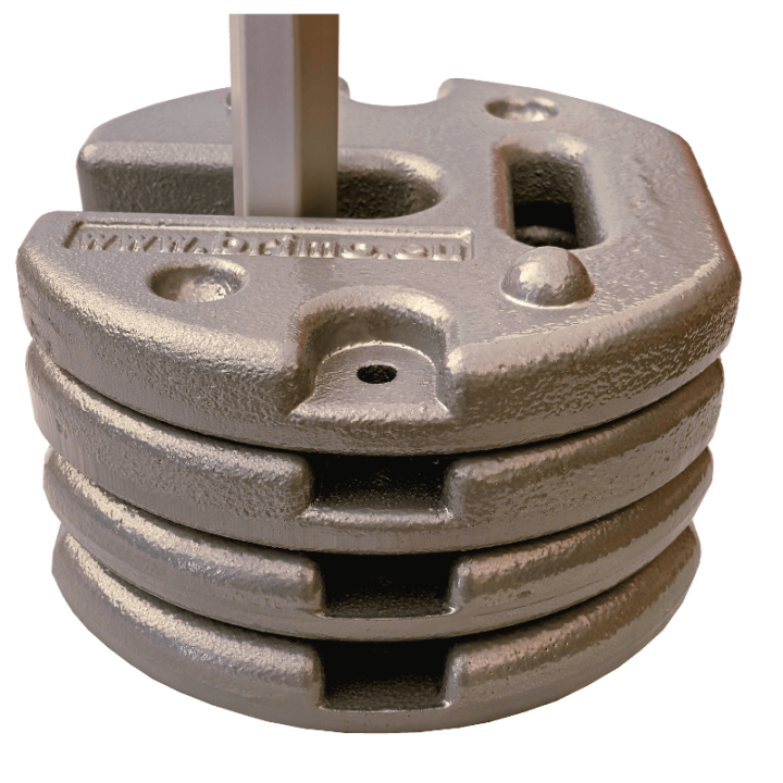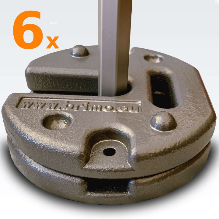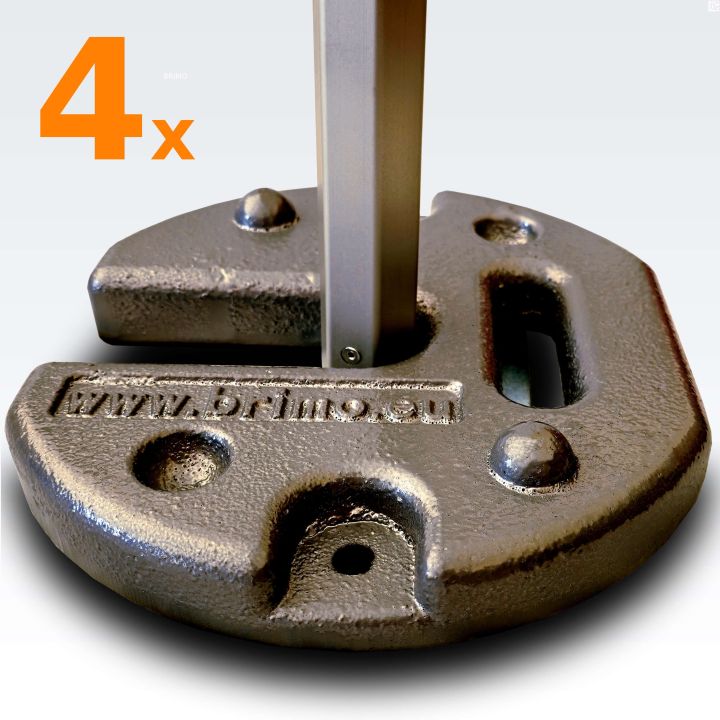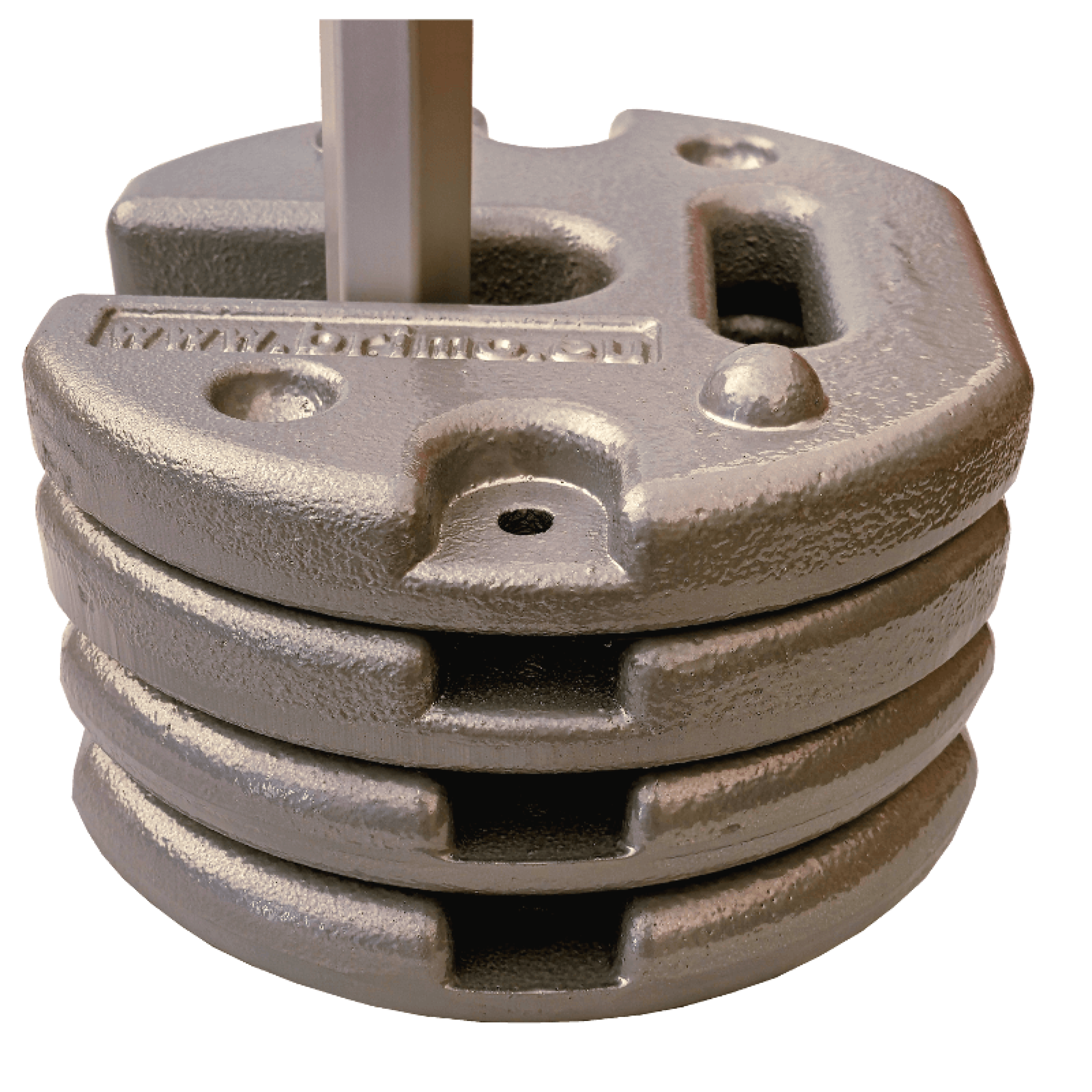 For telte på 3x3 m og større anbefaler vi at bruge 2 vægte pr. teltben, så hvis teltet har 4 ben, brug 8 vægte; for et telt med 6 ben, 12 stk. Udstyret med et praktisk håndtag, der gør det nemt at transportere. Vægtene kan også stables. For at undgå skader skal de opbevares direkte ved teltbenene. Lad ikke pladerne falde på en hård overflade, der er risiko for skader.